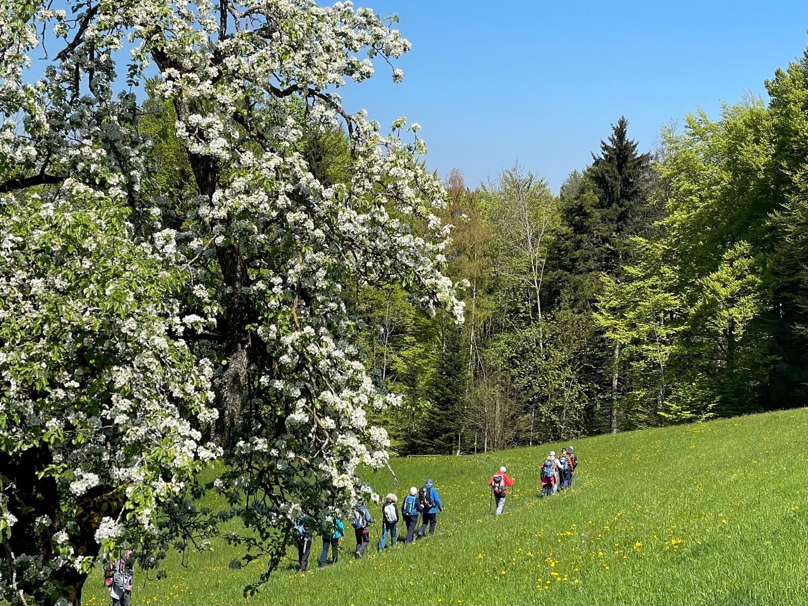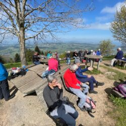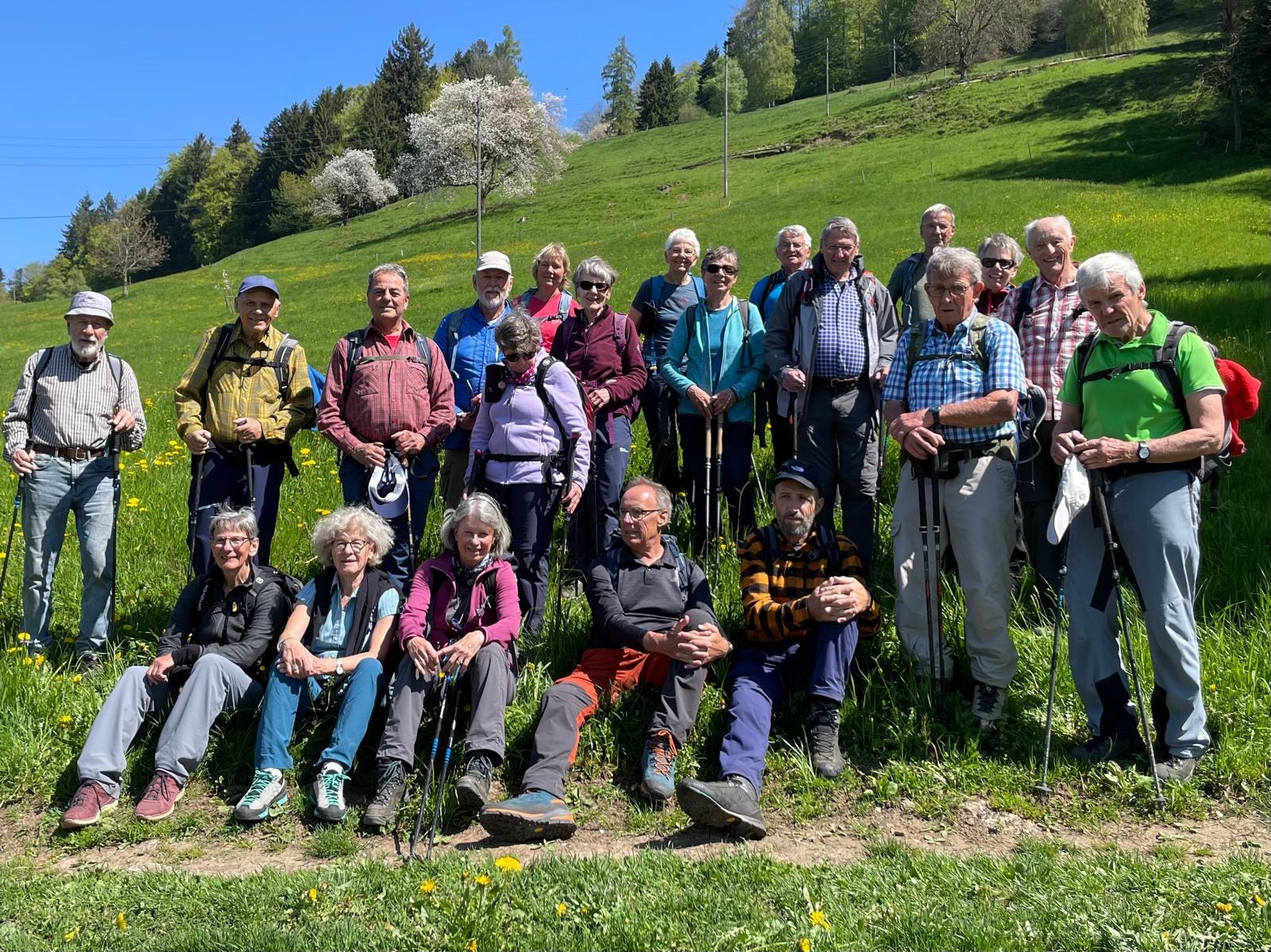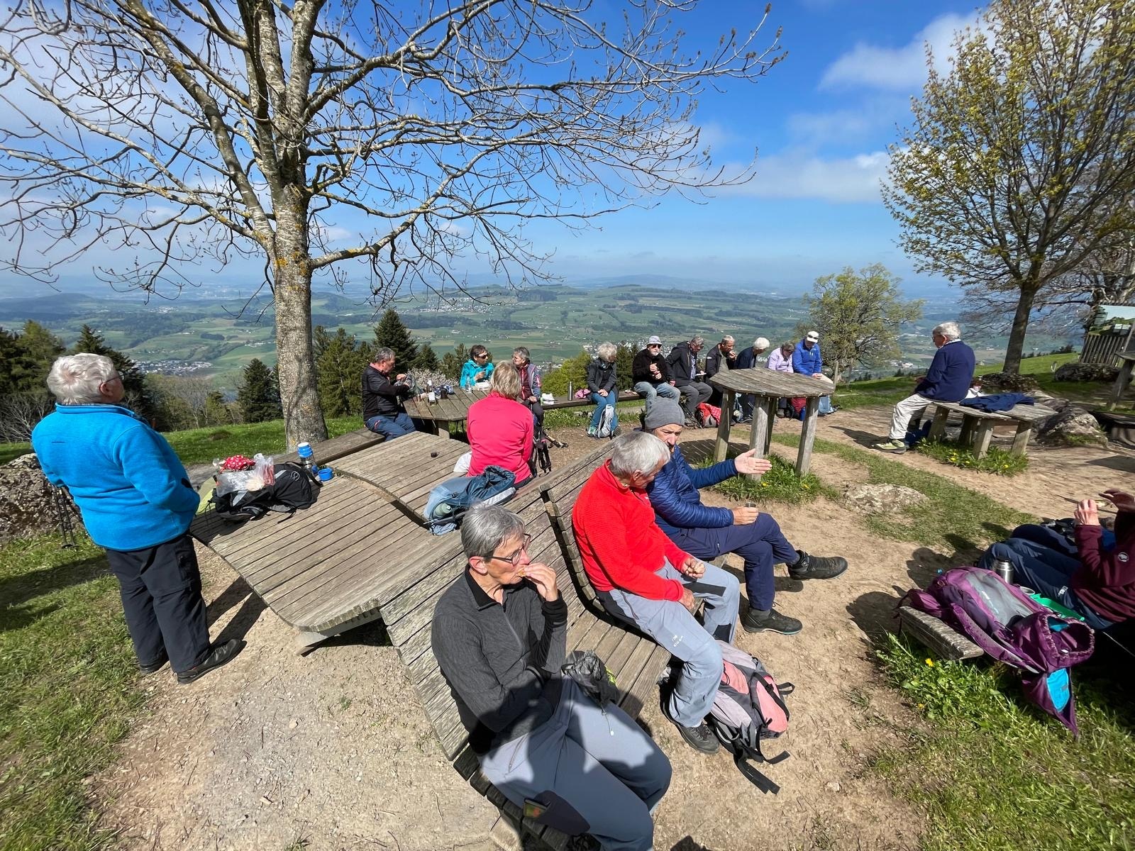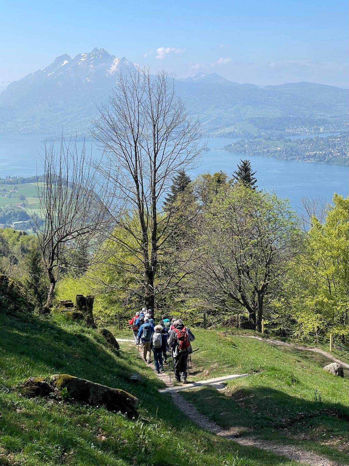 Beim Friedhof Küssnacht starten 22 Personen zur Tour auf die Seebodenalp. Auf Hartbelag ziehen wir hinauf zum Restaurant Alpenhof für den Kaffeehalt. Gestärkt folgt nun der relativ steile Aufstieg an blühenden Obstbäumen vorbei in den Wald mit vielen Treppenstufen. Die morgendliche Frische trug dazu bei, dass kaum jemand ins Schwitzen kam. Um die Mittagszeit erreichten wir unseren Pick-Nick Platz Färbers Egg und konnten auf freien Bänklein die mitgenommenen Speisen geniessen. Dazwischen erzählte uns Werner Episoden von seiner Heimat Küssnacht und der Rigi. Die leichte Bise sorgte bald für Hühnerhaut, sodass wir zum wärmenden Kaffee ins Restaurant Altruodisegg weiterzogen. Nach dem Getränk und zum Teil Dessert folgte der Abstieg via Steigade – Unter Flue – Chümimattli – Unterboden zurück zum Restaurant Alpenhof. Durch Wald- und Wiesenabschnitte war der Weg nicht mehr so steil. Die Sicht auf den See, Pilatus und das Unterland war eindrücklich. Nach einem Schlussgetränk (Rigi-Bier) in der Gartenwirtschaft folgte noch der kurze Abstieg zur Bus Station und die anschliessende Rückreise rundeten den schönen Wandertag ab.