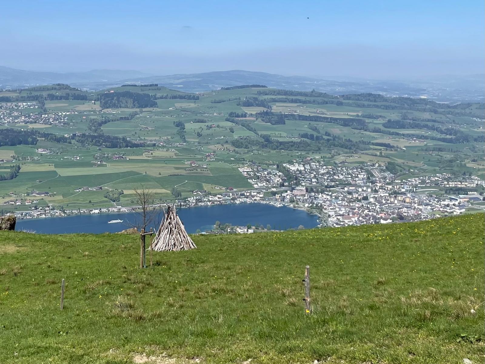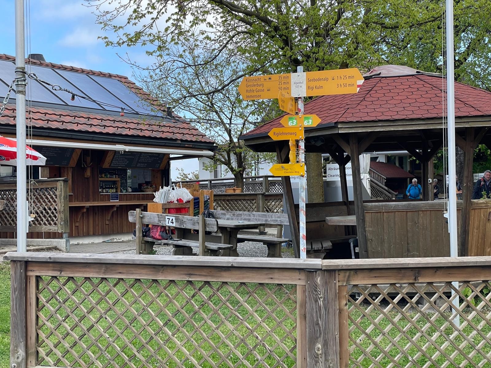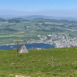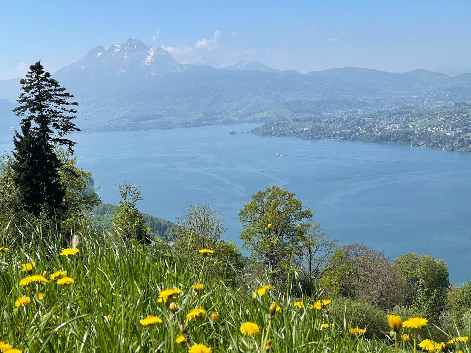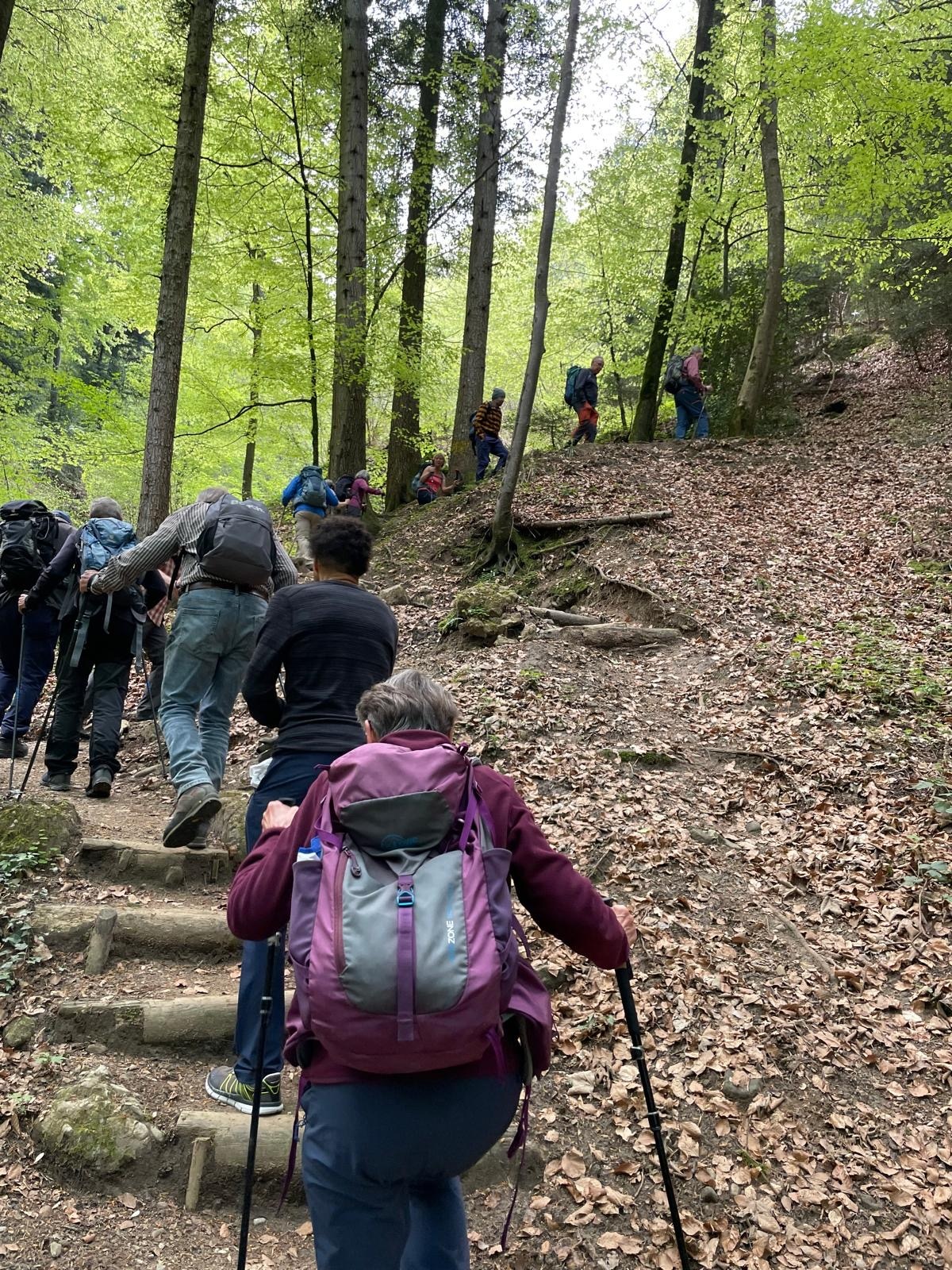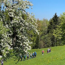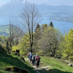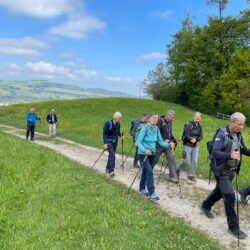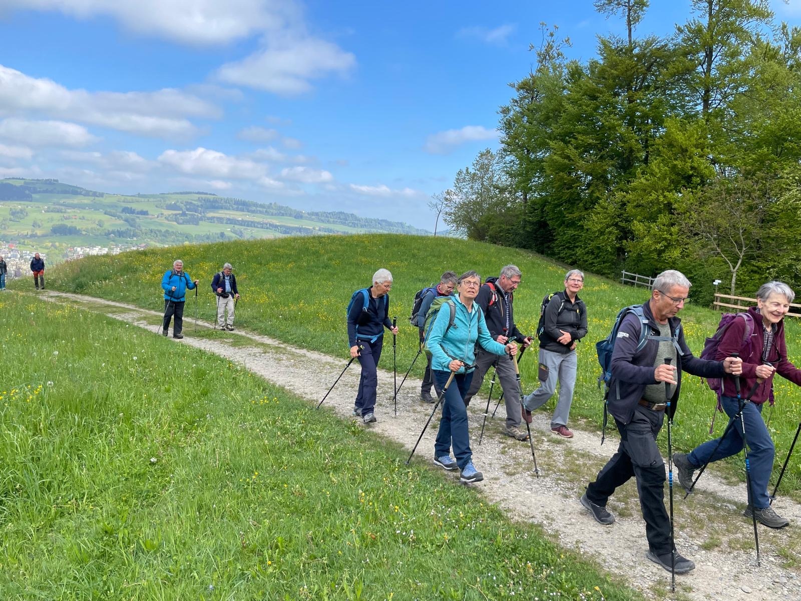 Beim Friedhof Küssnacht starten 22 Personen zur Tour auf die Seebodenalp. Auf Hartbelag ziehen wir hinauf zum Restaurant Alpenhof für den Kaffeehalt. Gestärkt folgt nun der relativ steile Aufstieg an blühenden Obstbäumen vorbei in den Wald mit vielen Treppenstufen. Die morgendliche Frische trug dazu bei, dass kaum jemand ins Schwitzen kam. Um die Mittagszeit erreichten wir unseren Pick-Nick Platz Färbers Egg und konnten auf freien Bänklein die mitgenommenen Speisen geniessen. Dazwischen erzählte uns Werner Episoden von seiner Heimat Küssnacht und der Rigi. Die leichte Bise sorgte bald für Hühnerhaut, sodass wir zum wärmenden Kaffee ins Restaurant Altruodisegg weiterzogen. Nach dem Getränk und zum Teil Dessert folgte der Abstieg via Steigade – Unter Flue – Chümimattli – Unterboden zurück zum Restaurant Alpenhof. Durch Wald- und Wiesenabschnitte war der Weg nicht mehr so steil. Die Sicht auf den See, Pilatus und das Unterland war eindrücklich. Nach einem Schlussgetränk (Rigi-Bier) in der Gartenwirtschaft folgte noch der kurze Abstieg zur Bus Station und die anschliessende Rückreise rundeten den schönen Wandertag ab.