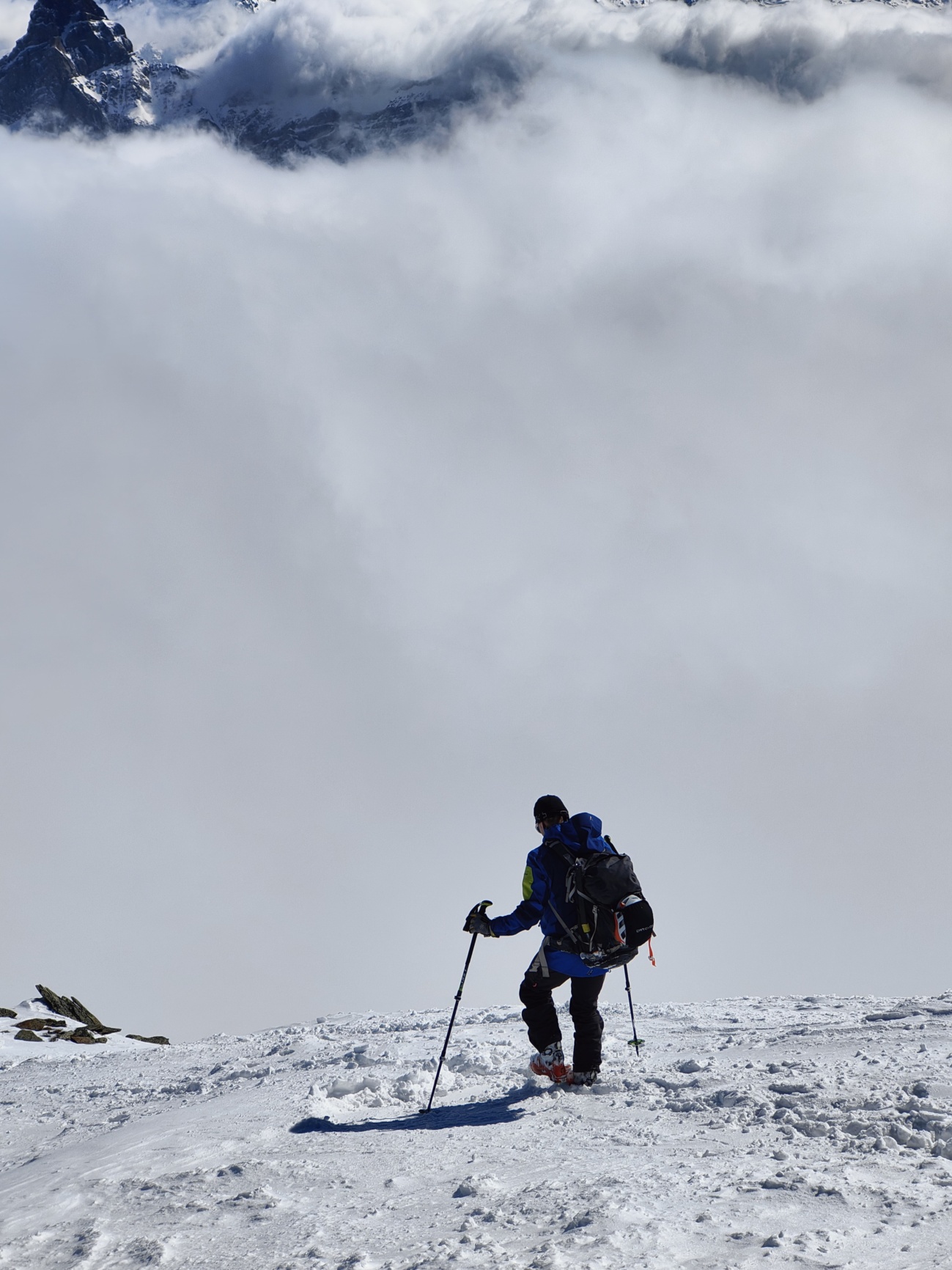Am ersten Tag konnten wir nach der Anreise direkt von Nufenen (1’560m) mit den Ski auf der anderen Talseite starten. Nach dem steilen unteren Teil erwarteten uns weiter oben schöne weite Hänge. Von der Gratschulter konnten wir bei Sonnenschein ein mögliches Tourenziel für den nächsten Tag begutachten und danach beim Apero den sonnigen Nachmittag geniessen.