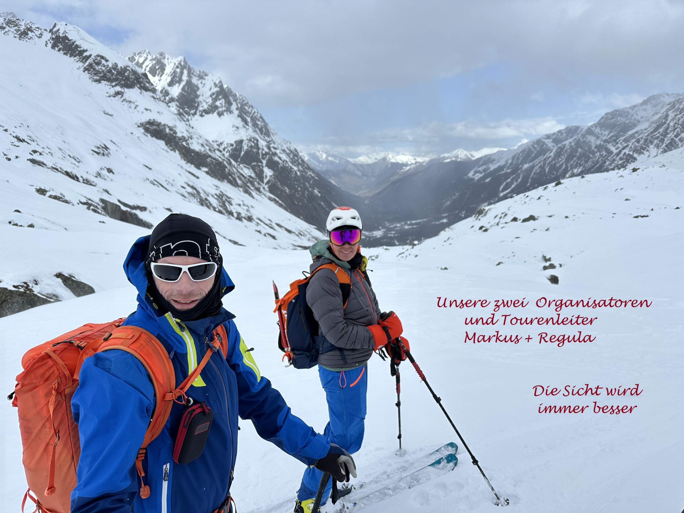 Regula Erni und Markus Gerber: Vielen, vielen Dank für die gute Organisation und Leitung der vier Skitourentage. Ihr beide hattet es bei diesem Wetter und der Lawinensituation nicht so einfach zu entscheiden, welchen Gipfel ist sicher für eine so grosse Gruppe wie wir waren.                                                      Allen Teilnehmenden: Dank Eurer Mithilfe konnten wir 4 schöne Tage im Unterwallis verbringen.