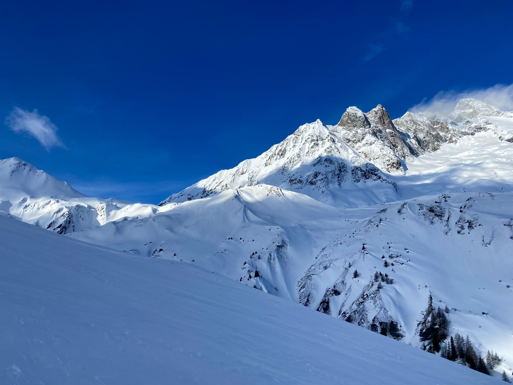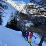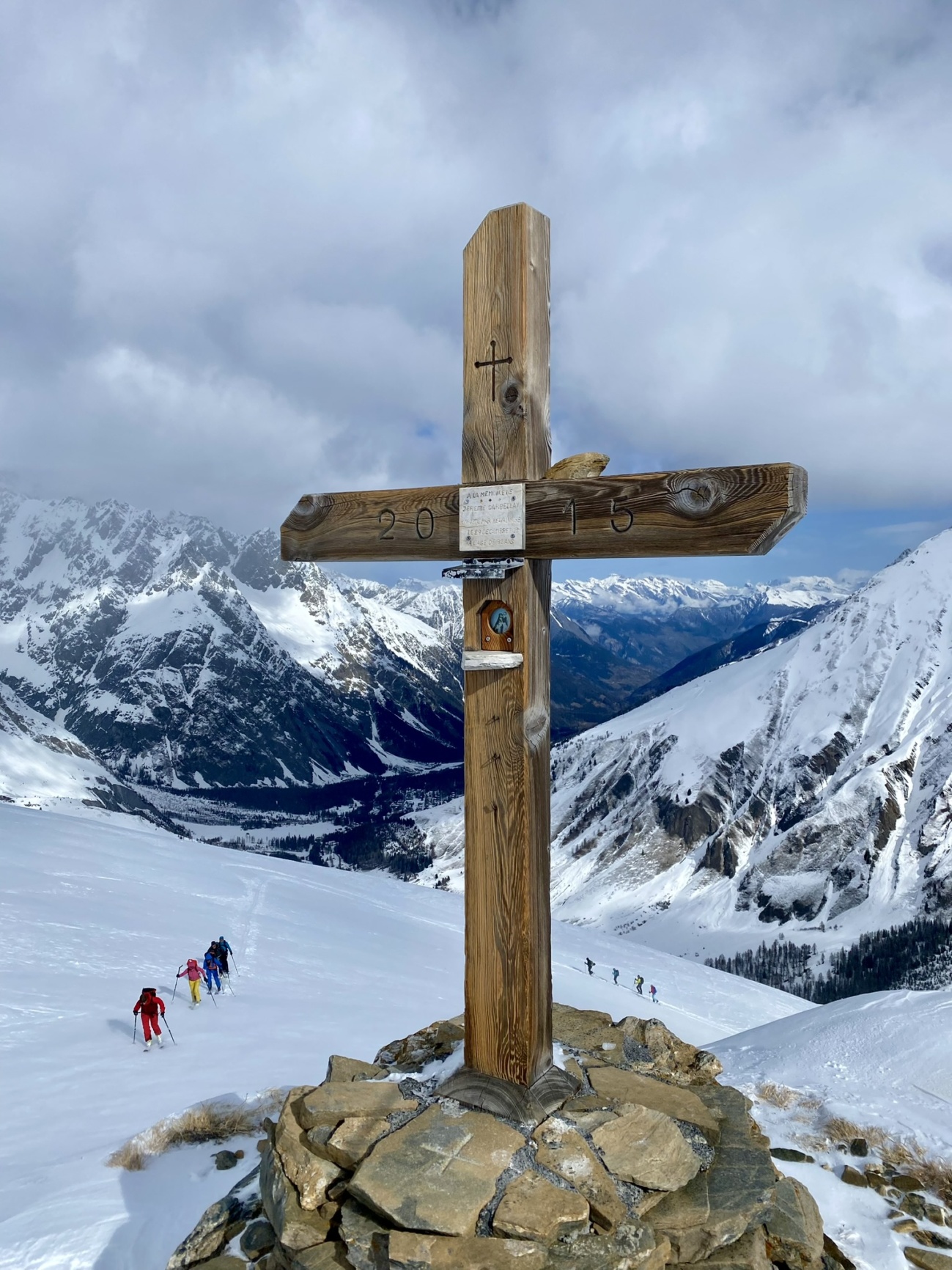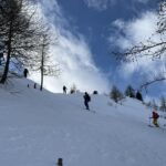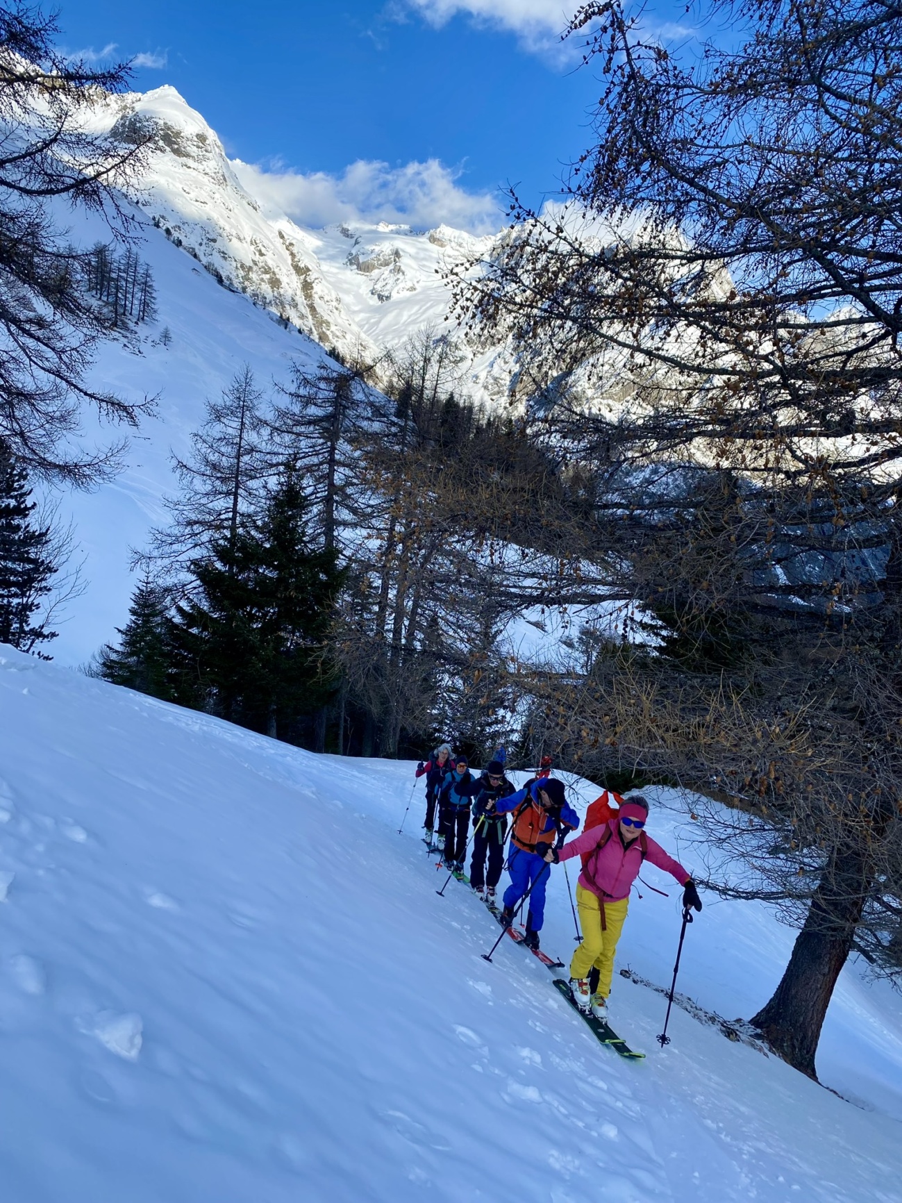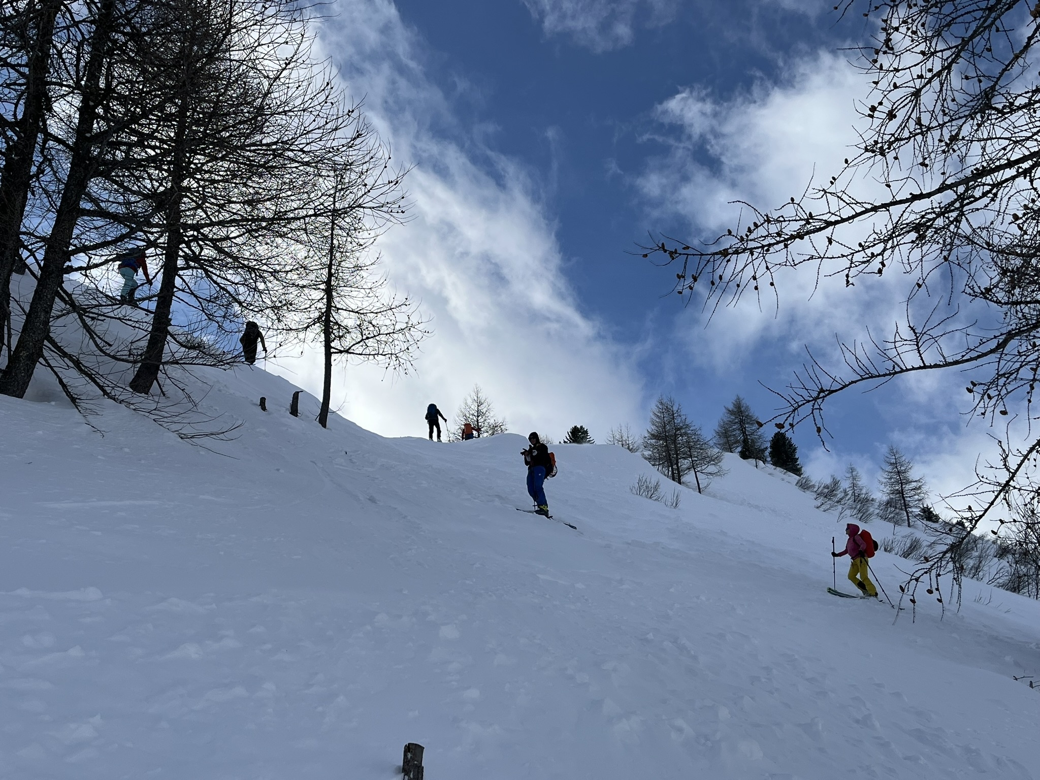 Samstag 2. März          Morgens beim Aufwachen ist blauer wolkenloser Himmel. Um 7 Uhr sitzen alle beim Morgenessen. Kurzer Fussmarsch bis Ende Dorf und schon können wir auf der Langlaufpiste dem Bach Dranse de Ferret folgen. Bei der Wende der Loipe steigen wir steile Alpweiden hoch auf den Gratrücken «Grêtet de Létemeyre», dem folgend bis zum Gipfel La Dotse 2’491 m. Wir haben Glück sind wir früh gestartet, denn der Südwind wird stärker und bringt Wolken mit sich. Auf dem Gipfel ist es neblig und der Wind wird immer stärker. Schnell sind wir Abfahrtsbereit und in zwei sechser Gruppen fahren wir in der Nähe der Aufstiegsspur entlang Talwärts. Auf der Abfahrt treffen wir sehr viele Skitourengänger im Aufstieg, die bei diesem Wind sicher nicht bis zum Gipfel aufsteigen. Den Nachmittag geniessen wir im Hotel mit Jassen oder bei einem Spaziergang zum Weiler Ferret. Auch heute geniessen wir ein gutes Nachtessen.