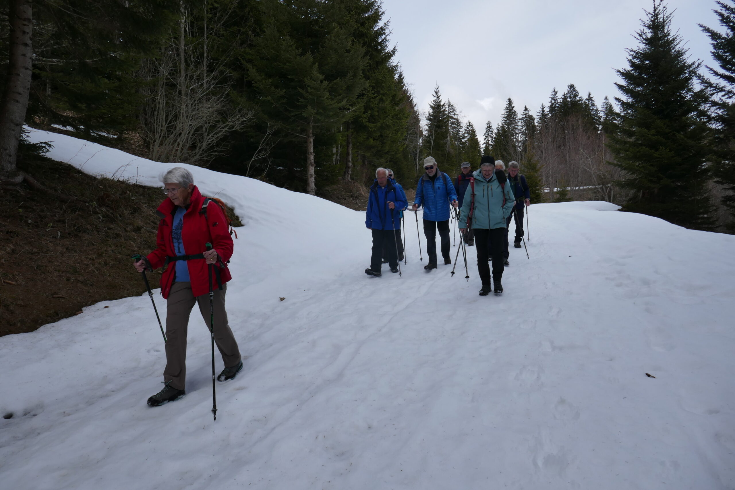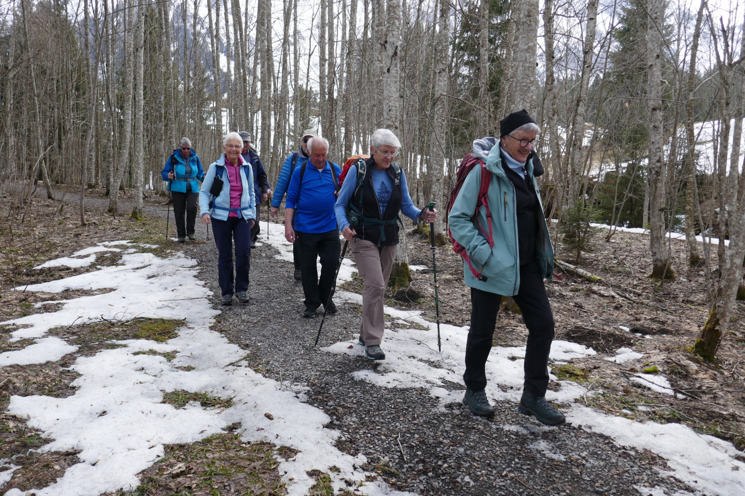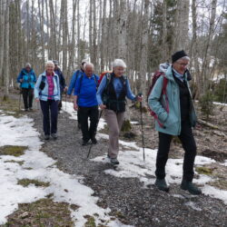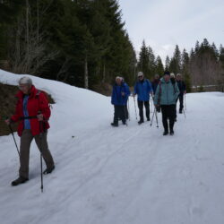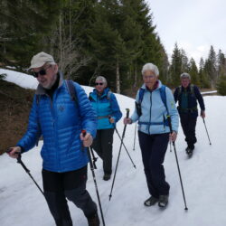 9 wanderlustige Teilnehmerinnen und Teilnehmer trafen sich zum Startkaffee in der «Bäckerstube» in Sörenberg ein. Der Himmel war aufgelockert und die Temperatur angenehm. Mit zunehmender Höhe hatten wir mehr Ausblick aufs Dorf und die gegenüberliegende Brienzerrothornkette. Da wir an der Sonnenseite unterwegs waren hatten wir praktisch keinen Schnee mehr. Das änderte sich aber als wir nach dem Mittagshalt den Abstieg, vorwiegend im Wald, unter die Füsse nahmen. Plötzlich waren wir wieder im Winter. Schuhkrallen gaben vermehrt Sicherheit. Ein beschauliches Weglein führte uns der Waldemme entlang zurück ins Dorf Sörenberg wo uns schon bald das Postauto nach Schüpfheim und der Zug ins Freiamt brachte.