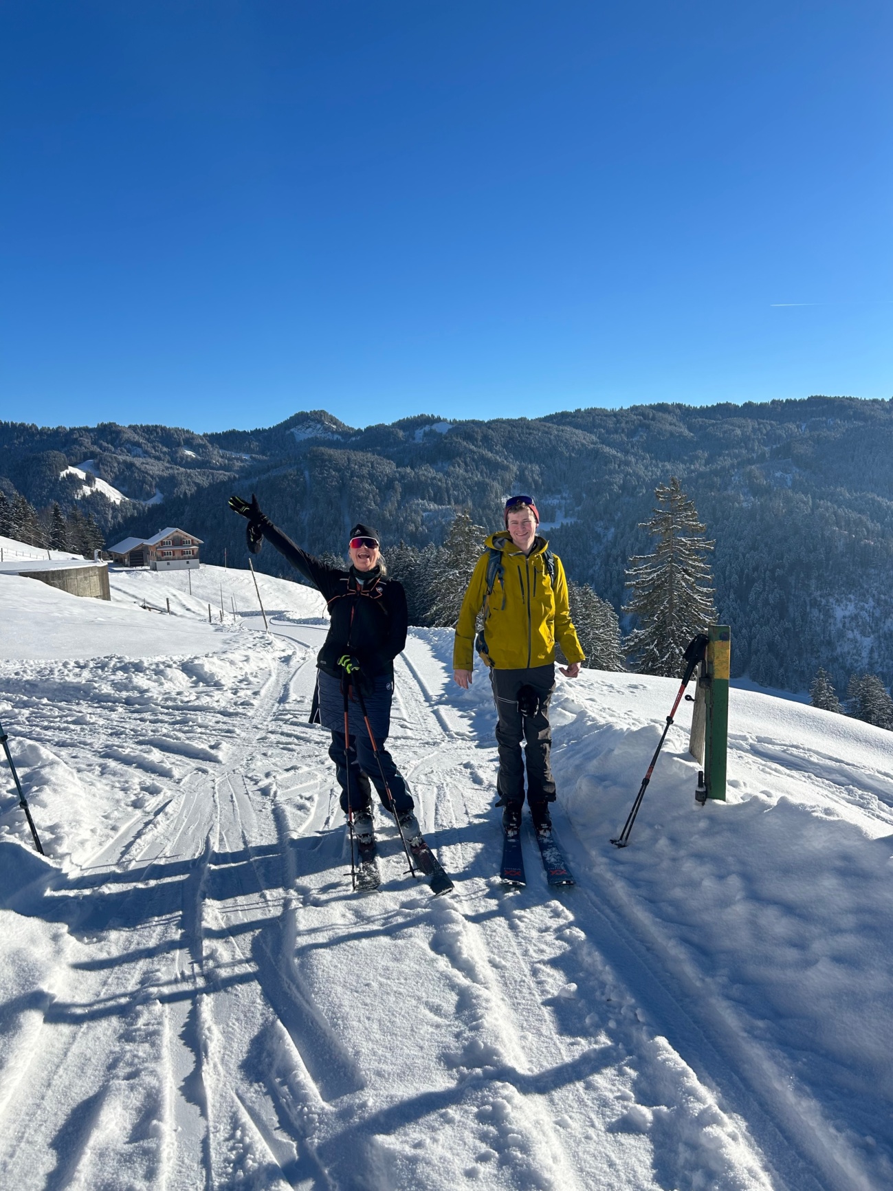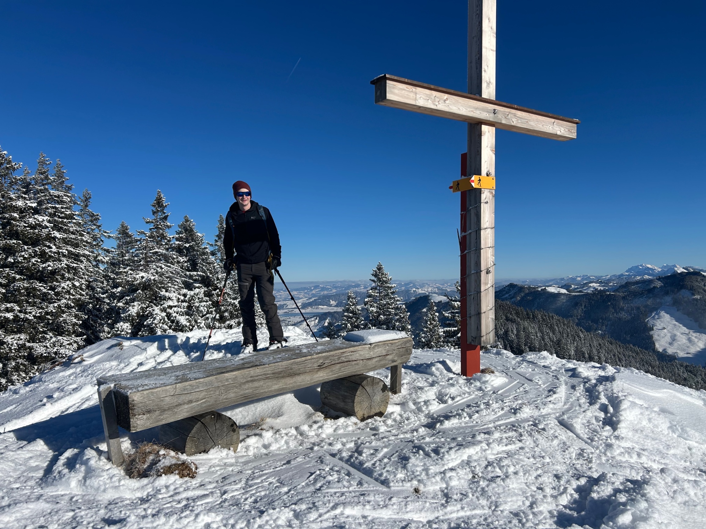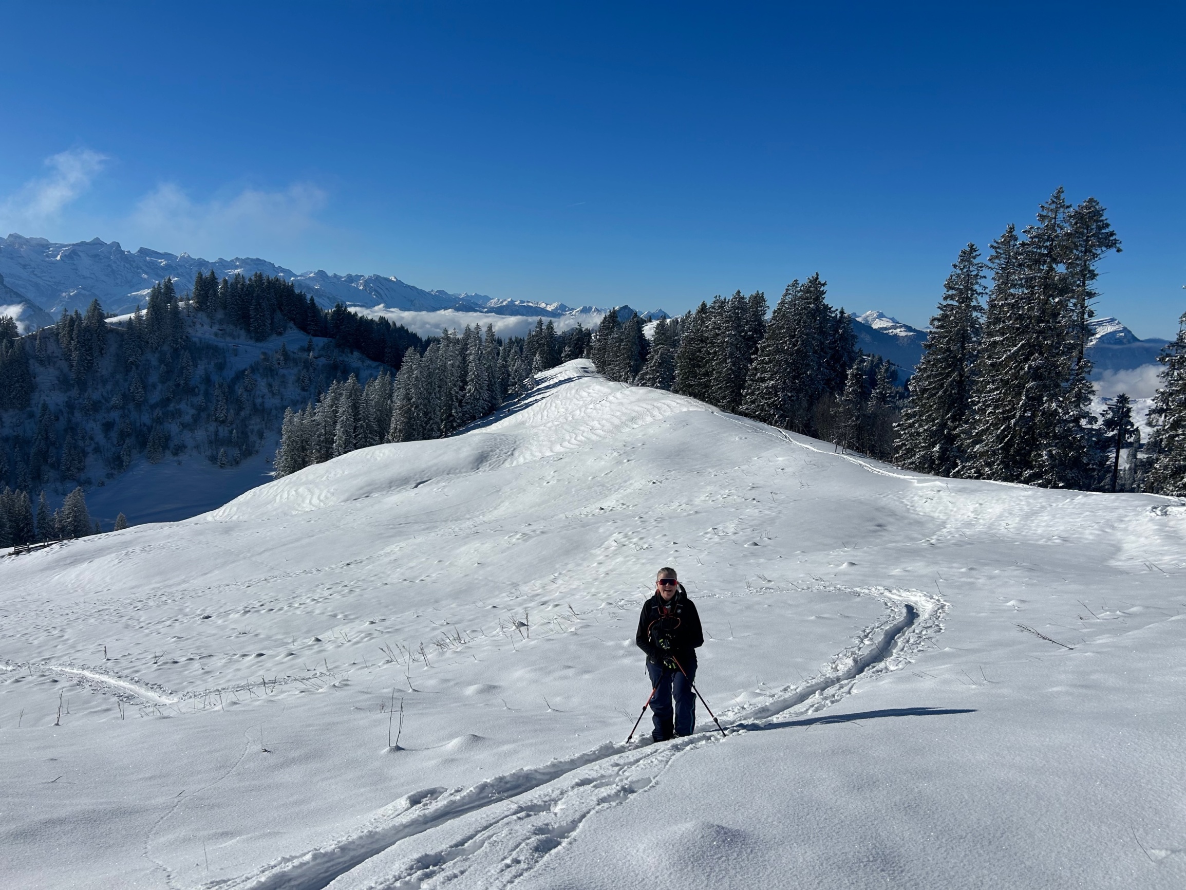 Endlich Schnee! Wie bestellt gab es am Vortag der Tour rund 30 cm Neuschnee ohne Unterlage, und uns erwartete am Sonntag ein sonniger, kalter Wintertag. Das Tourenziel war der Näbikenfirst 1565 m vom Alpthal aus. Vom Gipfel ging es immer der Kräte entlang über den Grossbrechenstock bis zur Nätschhöchi, um dann auf der Skipiste bis ins Brunni abzufahren zu können. Grösstenteils waren wir alleine unterwegs, bis wir im unteren Teil der beschneiten Skipiste im Trubel ankamen.