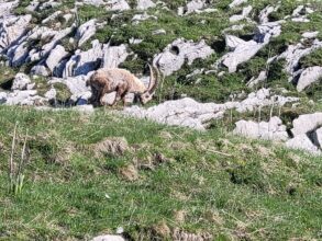 Zuerst steigen wir ein Stück zum Vanil Noir empor. Weil es oben noch Schnee hat, kommen die Wildtiere hinunter. Wir sollten grosse Chancen haben, um Gämse und Steinböcke beobachten zu können. Das lassen wir uns nicht entgehen. Wir gehen zurück zur Hütte, wo wir unsere Tageswanderung beginnen. Es ist ein wunderschöner Bergweg, an der Flanke des Vanil Noirs vorbei, einfach zum Geniessen. Ab der Alp Paray Doréna geht es über 2h konstant, aber nicht steil bergab, nach Châteu-d’Oex. Unsere letzte Nacht im Gebiet Pays d’Enhaut.